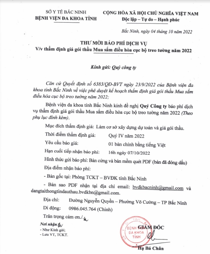 THƯ MỜI BÁO PHÍ DỊCH VỤ: V/v thẩm định giá gói thầu Mua sắm điều hoà cục bộ treo tường năm 2022