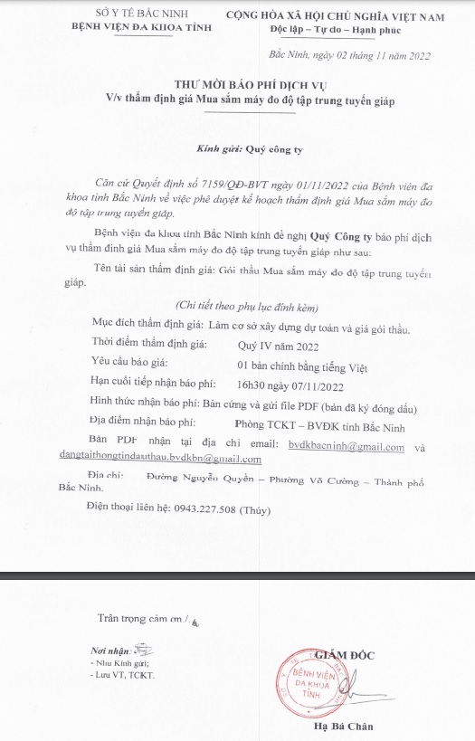 Thư mời báo phí dịch vụ V/v thẩm định giá Mua sắm máy đo độ tập trung tuyến giáp