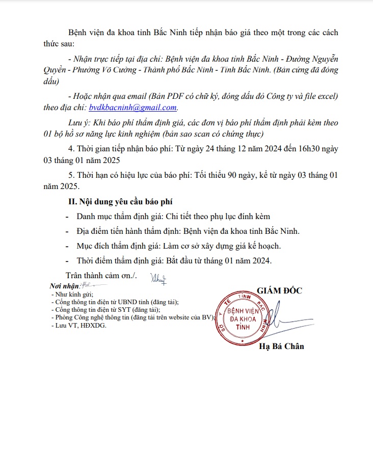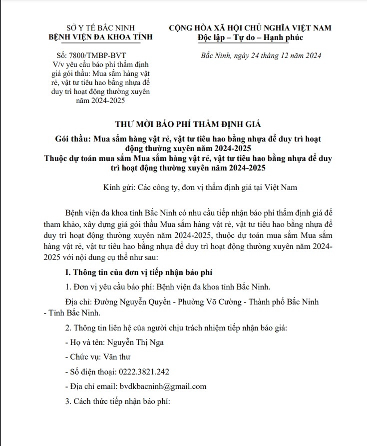 Thư mời báo phí thẩm định giá gói thầu: Mua sắm hàng vật rẻ, vật tư tiêu hao bằng nhựa để duy trì hoạt động thường xuyên năm 2024-2025