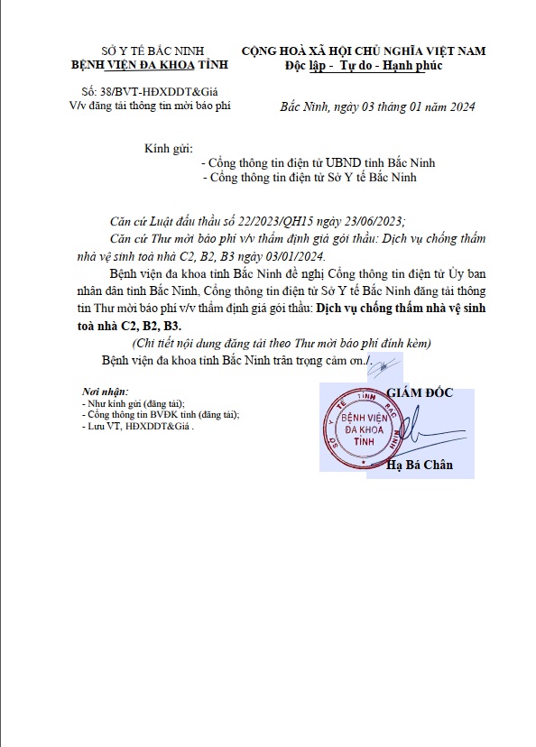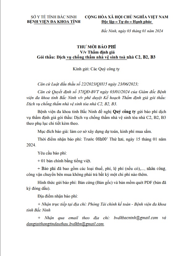 Thư mời báo phí V/v Thẩm định giá Gói thầu: Dịch vụ chống thấm nhà vệ sinh toà nhà C2, B2, B3