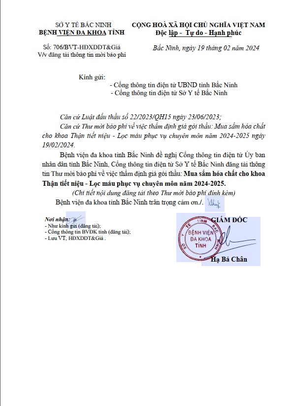Thư mời báo phí V/v Thẩm định giá Gói thầu: Mua sắm hoá chất cho khoa Thận tiết niệu - Lọc máu phục vụ chuyên môn năm 2024-2025