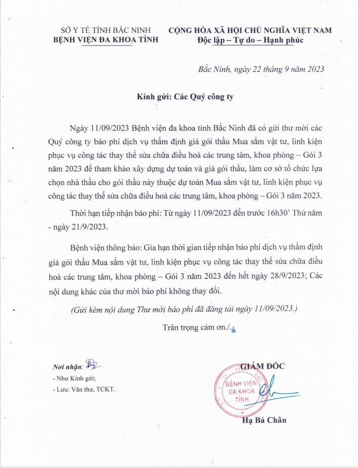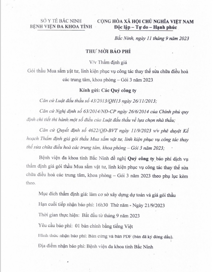 Thư mời báo phí V/v Thẩm định giá Gói thầu Mua sắm vật tư, linh kiện phục vụ công tác thay thế sửa chữa điều hoà các trung tâm, khoa phòng - Gói 3 năm 2023