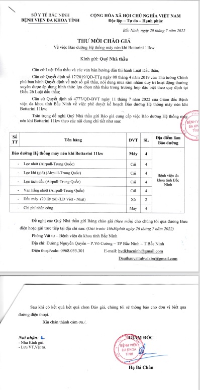 THƯ MỜI CHÀO GIÁ Về việc Bảo dưỡng hệ thống máy nén khí Bottarini 11kw