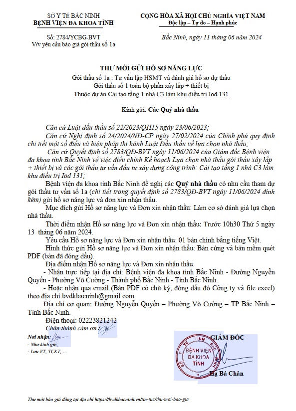 THƯ MỜI GỬI HỒ SƠ NĂNG LỰC Gói thầu số 1a: Tư vấn lập HSMT và đánh giá hồ sơ dự thầu Gói thầu số 1 toàn bộ phần xây lắp và thiết bị Thuộc dự án Cải tạo tầng 1 nhà C3 làm khu điều trị Iod 131