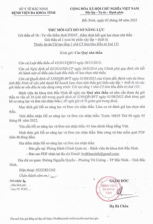 THƯ MỜI GỬI HỒ SƠ NĂNG LỰC GÓI THẦU SỐ 1B: TƯ VẤN THẨM ĐỊNH HSMT, THẨM ĐỊNH KẾT QUẢ LỰA CHỌN NHÀ THẦU GÓI THẦU SỐ 1 TOÀN BỘ PHẦN XÂY LẮP THIẾT BỊ THUỘC DỰ ÁN CẢI TẠO TẦNG 1 NHÀ C3 LÀM KHU ĐIỀU TRỊ IOD 131