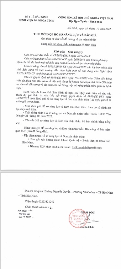 THƯ MỜI NỘP HỒ SƠ NĂNG LỰC VÀ BÁO GIÁ Gói thầu tư vấn viết đề cương và dự toán chi tiết Nâng cấp mở rộng phần mềm quản lý bệnh viện