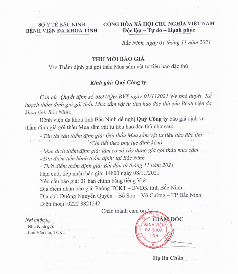 Thư mời Thẩm định giá Gói thầu mua sắm vật tư tiêu hao đặc thù