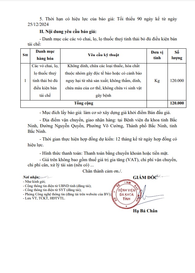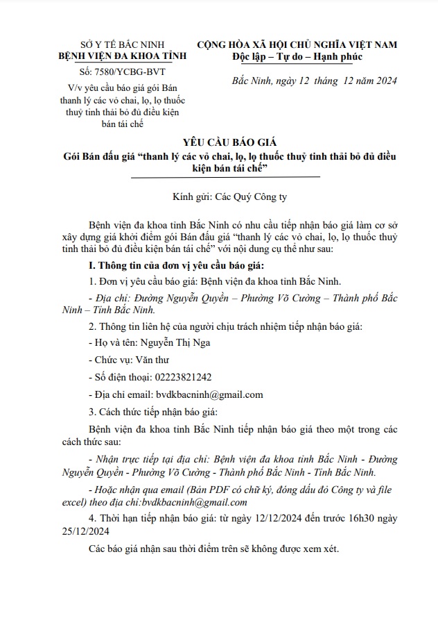 Yêu cầu báo giá gói Bán thanh lý các vỏ chai, lọ, lọ thuốc thuỷ tinh thải bỏ đủ điều kiện bán tái chế