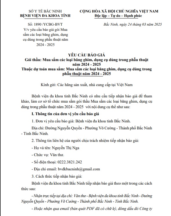 Yêu cầu báo giá gói Mua sắm các loại băng ghim, dụng cụ dùng trong phẫu thuật năm 2024 - 2025