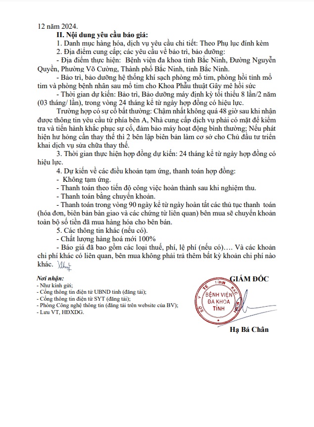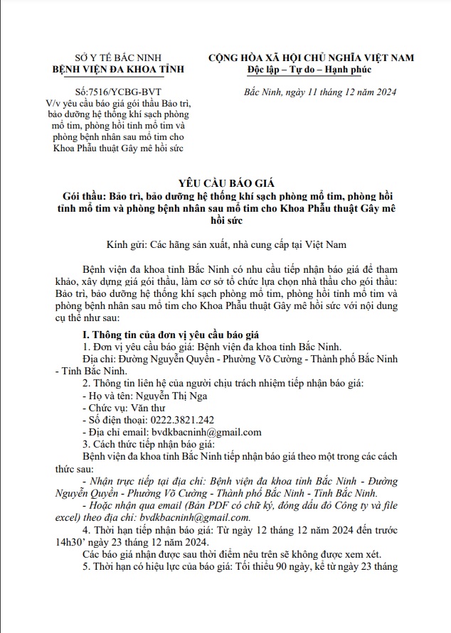 Yêu cầu báo giá gói thầu Bảo trì, bảo dưỡng hệ thống khí sạch phòng mổ tim, phòng hồi tỉnh mổ tim và phòng bệnh nhân sau mổ tim và phòng bệnh nhân sau mổ tim cho Khoa Phẫu thuật Gây mê hồi sức