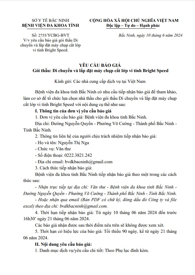 Yêu cầu báo giá gói thầu di chuyển và lắp đặt máy chụp cắt lớp vi tính Bright Speed