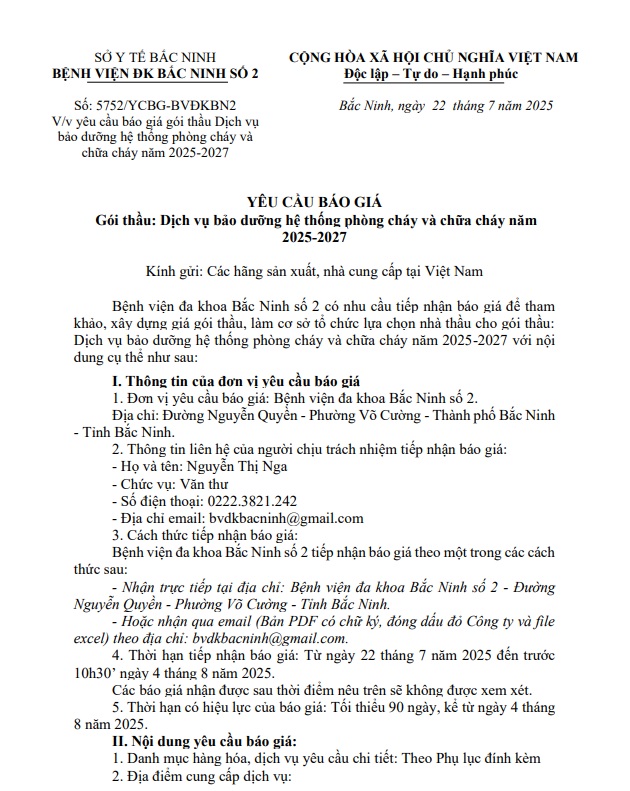 Yêu cầu báo giá gói thầu Dịch vụ bảo dưỡng hệ thống phòng cháy và chữa cháy năm 2025-2027