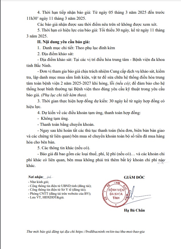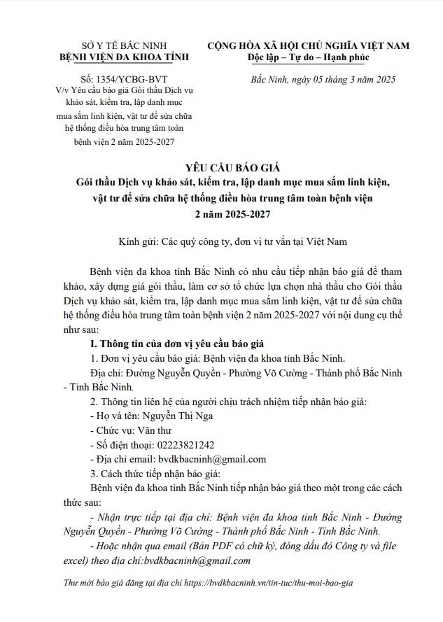Yêu cầu báo giá Gói thầu Dịch vụ khảo sát, kiểm tra, lập danh mục mua sắm linh kiện, vật tư để sửa chữa hệ thống điều hòa trung tâm toàn bệnh viện 2 năm 2025-2027