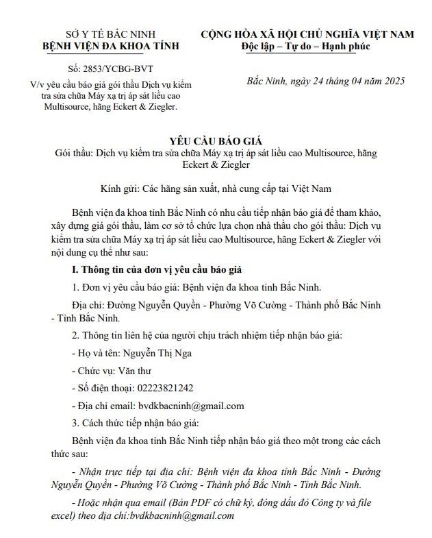 Bệnh viện đa khoa tỉnh Bắc Ninh yêu cầu về việc đăng tải thông tin gia hạn thời gian tiếp nhận báo giá gói thầu: Mua sắm vật tư điện, nước, cơ khí duy trì hoạt động thường xuyên năm 2023 ( Gói số 2)
