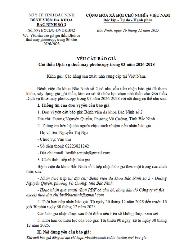 Yêu cầu báo giá gói thầu Dịch vụ thuê máy photocopy trong 03 năm 2026-2028