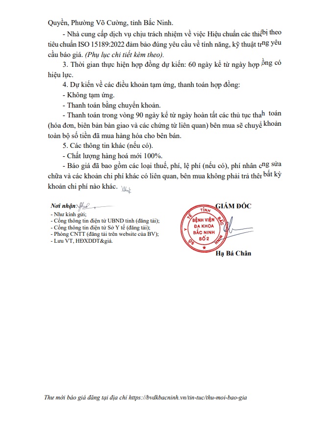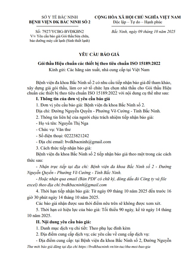 Yêu cầu báo giá Gói thầu Hiệu chuẩn các thiết bị theo tiêu chuẩn ISO 15189:2022