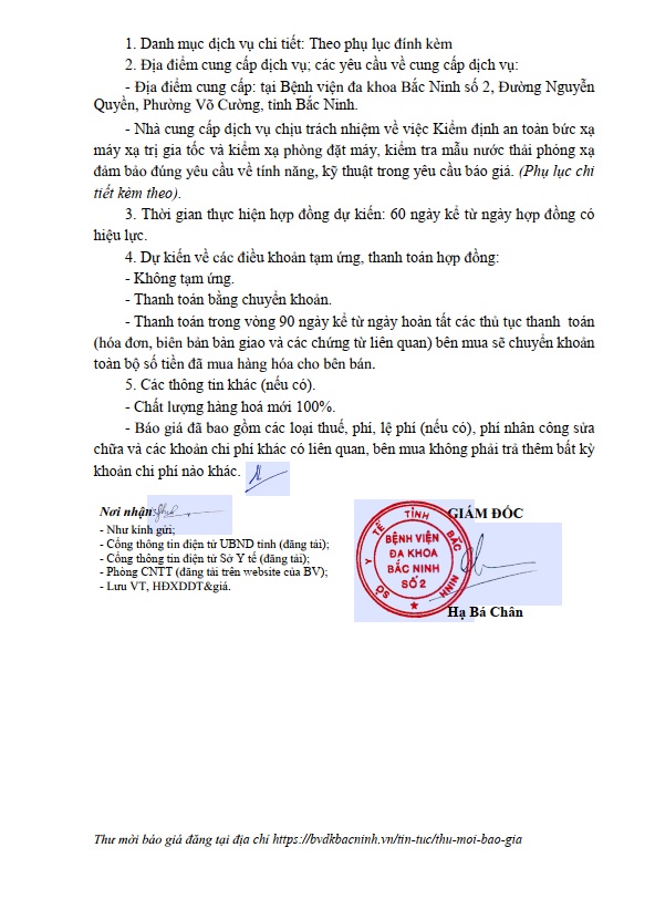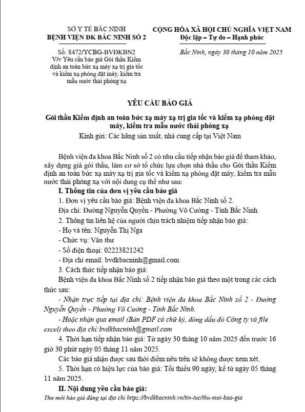 Yêu cầu báo giá Gói thầu Kiểm định an toàn bức xạ máy xạ trị gia tốc và kiểm xạ phòng đặt máy, kiểm tra mẫu nước thải phóng xạ