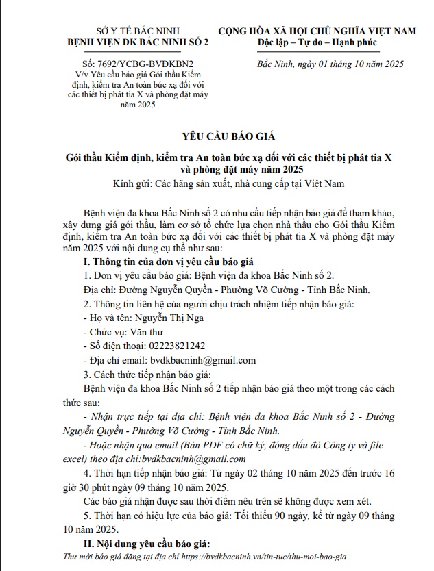 Yêu cầu báo giá Gói thầu Kiểm định, kiểm tra An toàn bức xạ đối với các thiết bị phát tia X và phòng đặt máy năm 2025