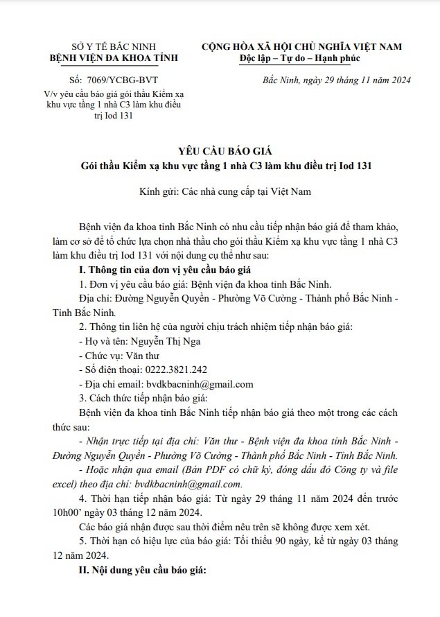 Yêu cầu báo giá Gói thầu: Kiểm xạ khu vực tầng 1 nhà C3 làm khu điều trị Iod 131