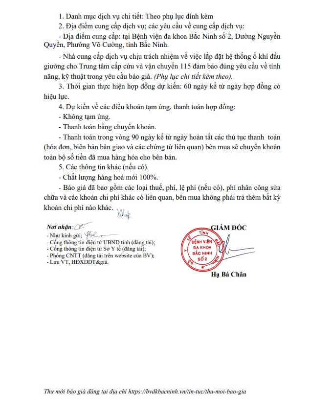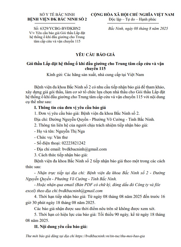 Yêu cầu báo giá Gói thầu Lắp đặt hệ thống ổ khí đầu giường cho Trung tâm cấp cứu và vận chuyển 115