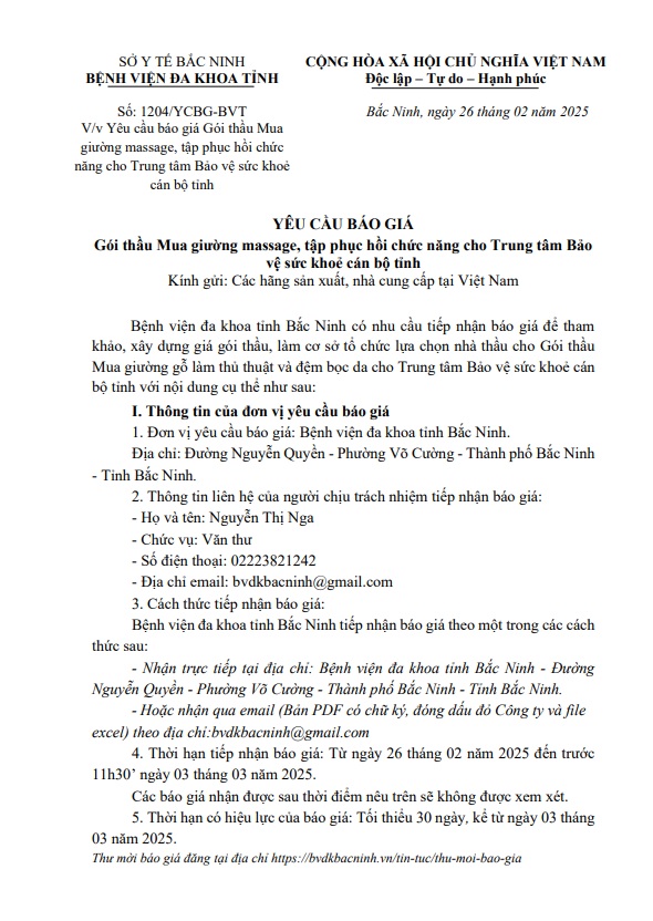 Yêu cầu báo giá Gói thầu Mua giường massage, tập phục hồi chức năng cho Trung tâm Bảo vệ sức khoẻ cán bộ tỉnh