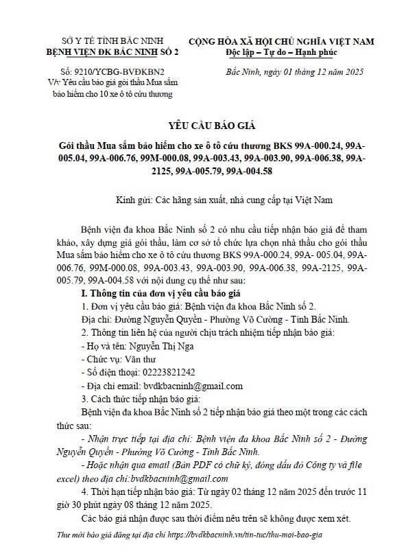Yêu cầu báo giá gói thầu Mua sắm bảo hiểm cho 10 xe ô tô cứu thương BKS 99A-000.24, 99A- 005.04, 99A-006.76, 99M-000.08, 99A-003.43, 99A-003.90, 99A-006.38, 99A-2125, 99A-005.79, 99A-004.58