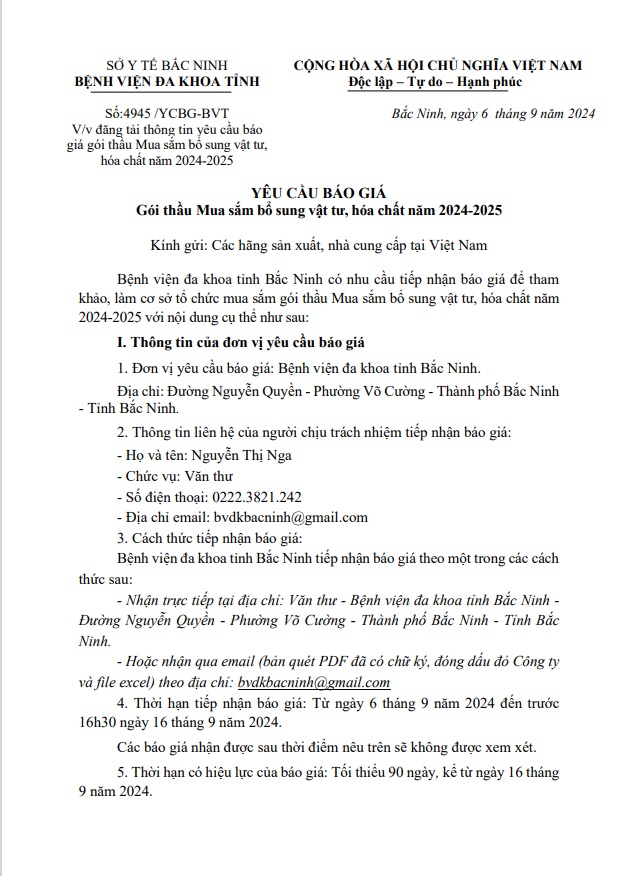 Yêu cầu cung cấp báo giá và kết quả lựa chọn nhà thầu gói thầu mua sắm thuốc generic tại Bệnh viện đa khoa tỉnh Bắc Ninh năm 2024-2025 ( Lần 2)