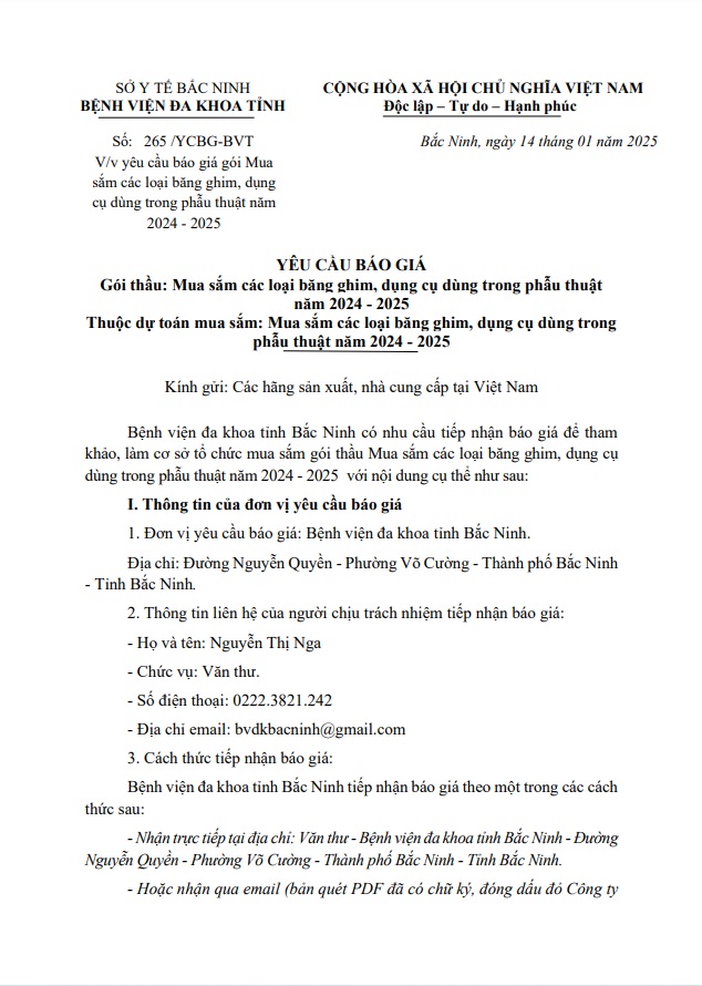 Yêu cầu báo giá Gói thầu Mua sắm các loại băng ghim, dụng cụ dùng trong phẫu thuật năm 2024 – 2025