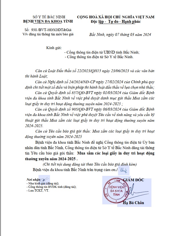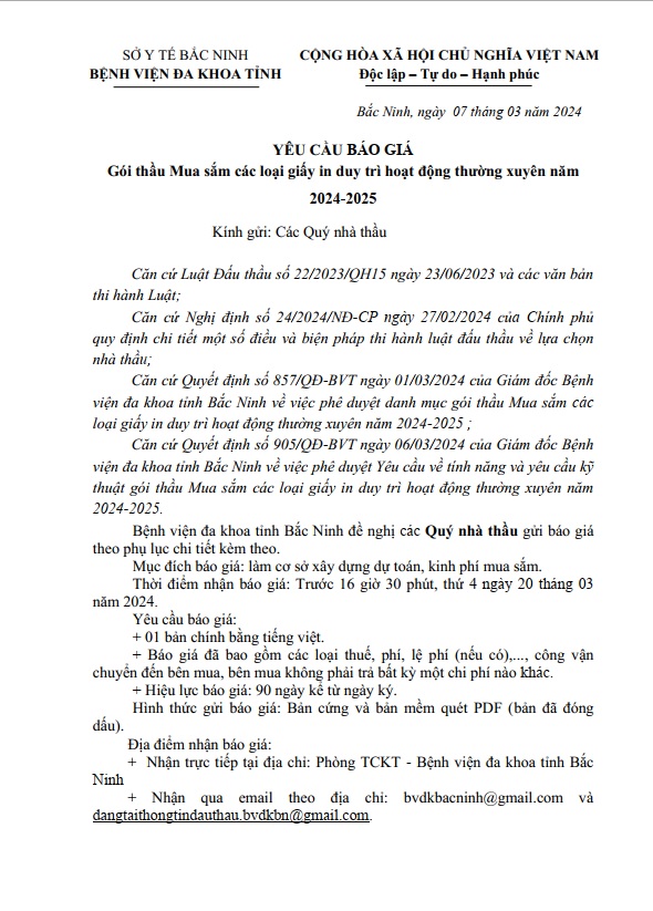 Yêu cầu báo giá Gói thầu Mua sắm các loại giấy in diuy trì hoạt động thường xuyên năm 2024-2025