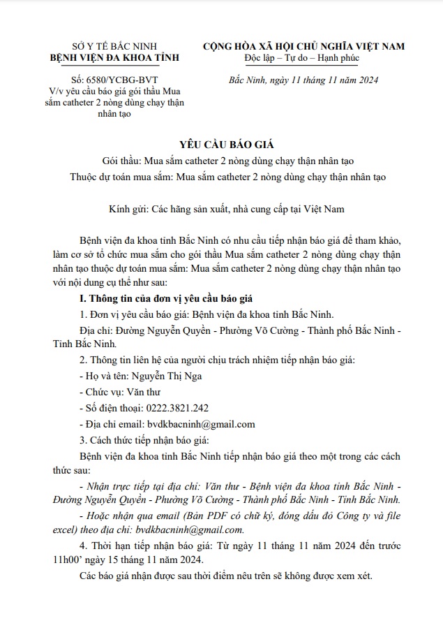 Yêu cầu báo giá gói thầu Mua sắm catheter 2 nòng dùng chạy thận nhân tạo Thuộc dự toán mua sắm: Mua sắm catheter 2 nòng dùng chạy thận nhân tạo