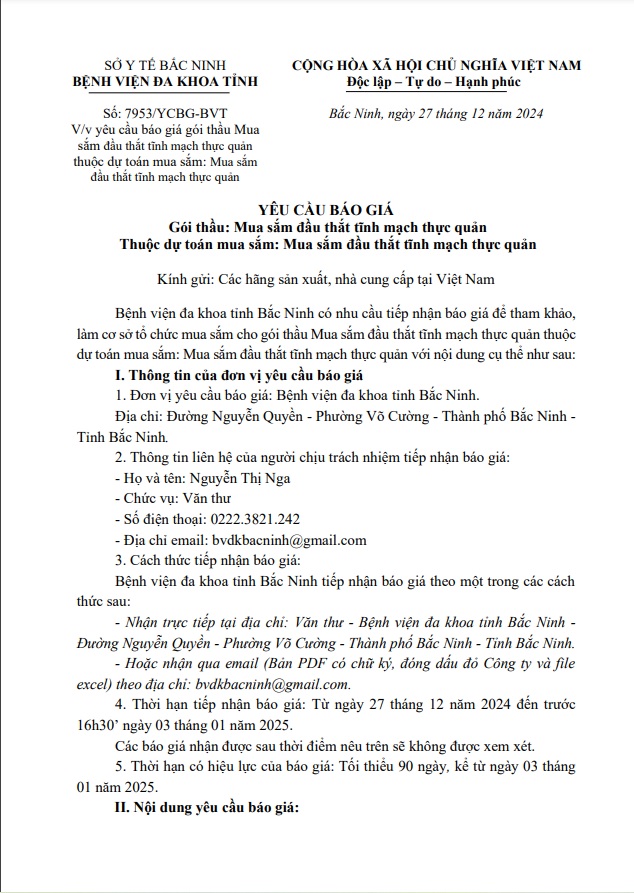 Yêu cầu báo giá Gói thầu: Mua sắm đầu thắt tĩnh mạch thực quản Thuộc dự toán mua sắm: Mua sắm đầu thắt tĩnh mạch thực quản