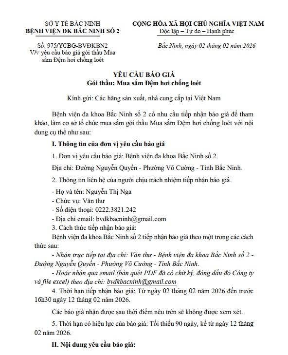 Yêu cầu báo giá gói thầu Thuê dịch vụ tư vấn xây dựng Hồ sơ thuyết minh An toàn thông tin mạng theo cấp độ cho hệ thống mạng, hệ thống thông tin của Bệnh viện đa khoa Bắc Ninh số 2