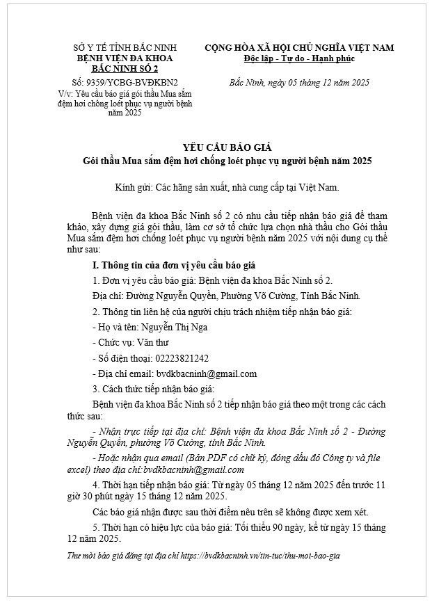 Yêu cầu báo giá gói thầu Mua sắm đệm hơi chống loét phục vụ người bệnh năm 2025