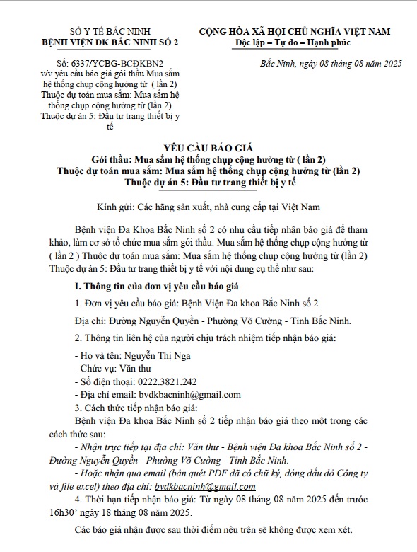 Yêu cầu báo giá gói thầu mua sắm hệ thống chụp cộng hưởng từ (lần 2) Thuộc dự toán mua sắm: Mua sắm hệ thống chụp cộng hưởng từ (lần 2) thuộc dự án 5: Đầu tư trang thiết bị y tế