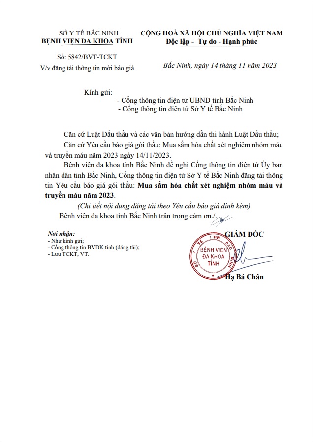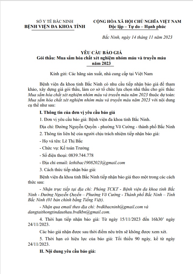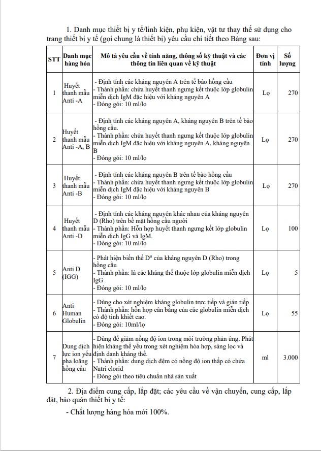 Yêu cầu báo giá Gói thầu: Mua sắm hoá chất xét nghiệm nhóm máu và truyền máu
