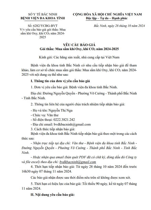 Yêu cầu báo giá Gói thầu Mua sắm khí Oxy, khí CO2 năm 2024-2025