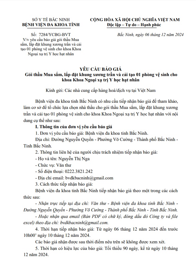 Yêu cầu báo giá Gói thầu: Mua sắm, lắp đặt khung xương trần và cải tạo 01 phòng vệ sinh cho khoa Khoa Ngoại xạ trị Y học hạt nhân