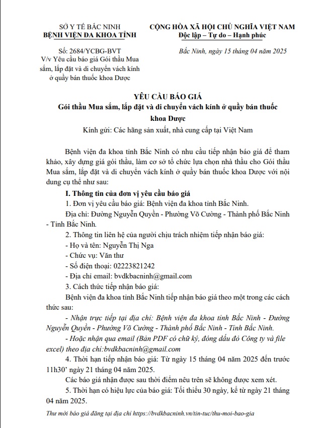 Yêu cầu báo giá Gói thầu Mua sắm, lắp đặt và di chuyển vách kính ở quầy bán thuốc khoa Dược