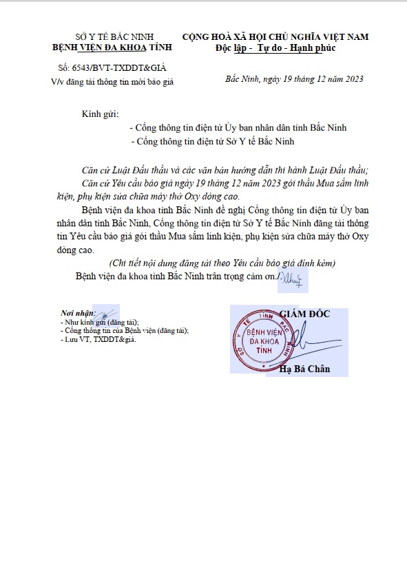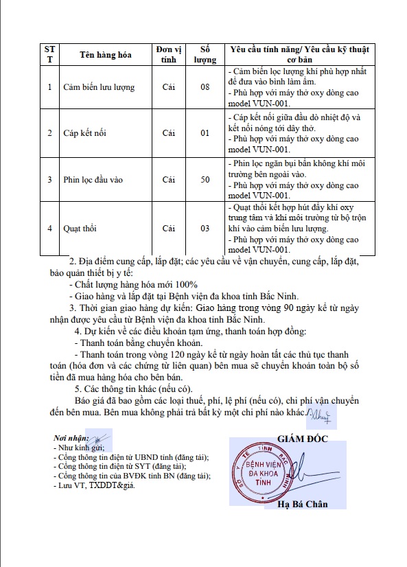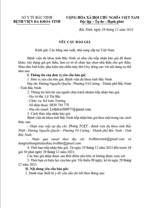Yêu cầu báo giá gói thầu: Mua sắm linh kiện, phụ kiện sửa chữa máy thở Oxy dòng cao
