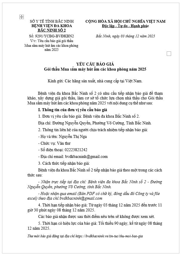 Yêu cầu báo giá gói thầu Mua sắm máy hút ẩm các khoa phòng năm 2025