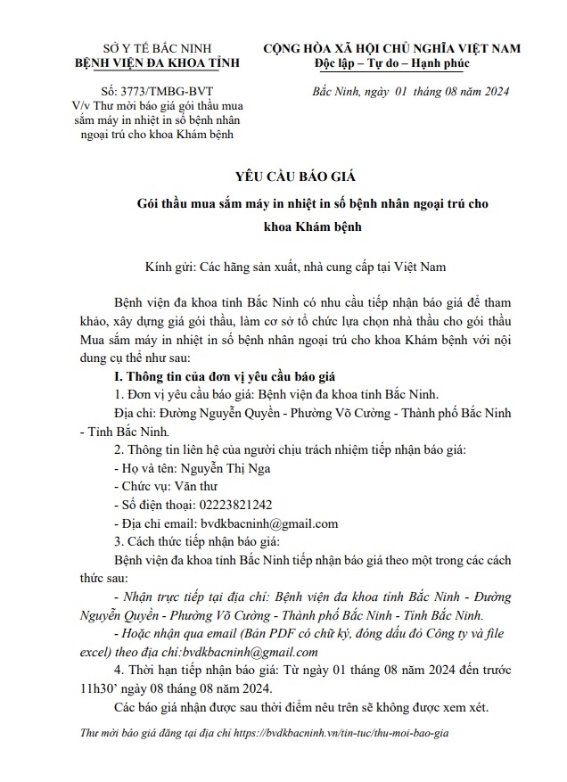 Yêu cầu báo giá Gói thầu mua sắm máy in nhiệt in số bệnh nhân ngoại trú cho khoa Khám bệnh