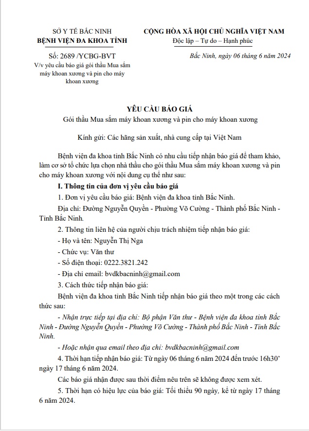 Yêu cầu báo giá Gói thầu Mua sắm máy khoan xương và pin cho máy khoa xương