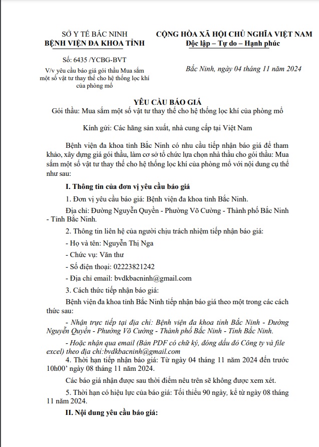 Yêu cầu báo giá Gói thầu Mua sắm một số vật tư thay thế cho hệ thống lọc khí của Phòng mổ