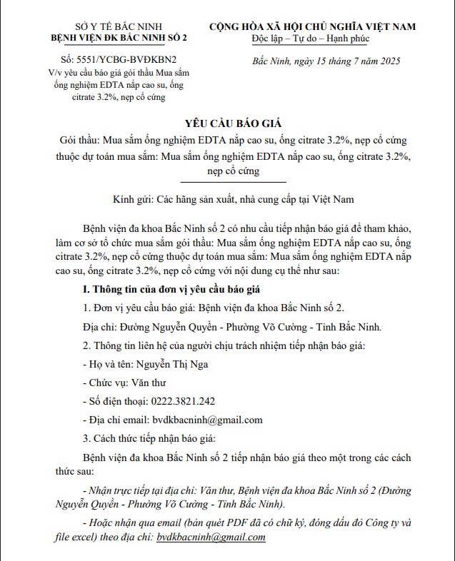 Yêu cầu báo giá gói thầu Mua sắm ống nghiệm EDTA nắp cao su, ống citrate 3.2, nẹp cổ cứng