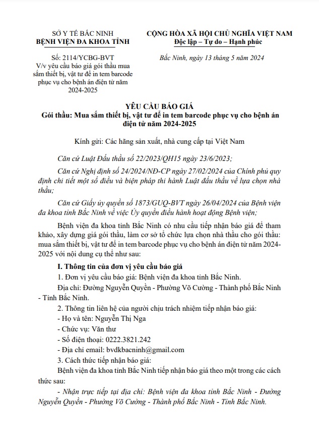 Yêu cầu báo giá gói thầu: Mua sắm thiết bị, vật tư để in tem barcode phục vụ cho bệnh án điện tử năm 2024-2025