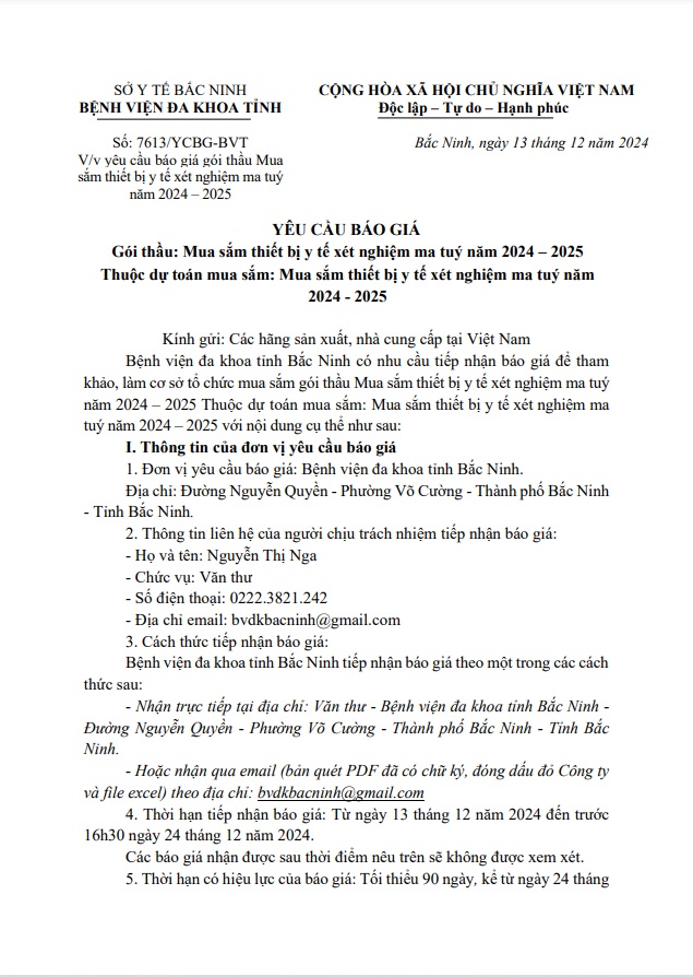 Yêu cầu báo giá Gói thầu: Mua sắm thiết bị y tế xét nghiệm ma tuý năm 2024 – 2025 Thuộc dự toán mua sắm: Mua sắm thiết bị y tế xét nghiệm ma tuý năm 2024 - 2025