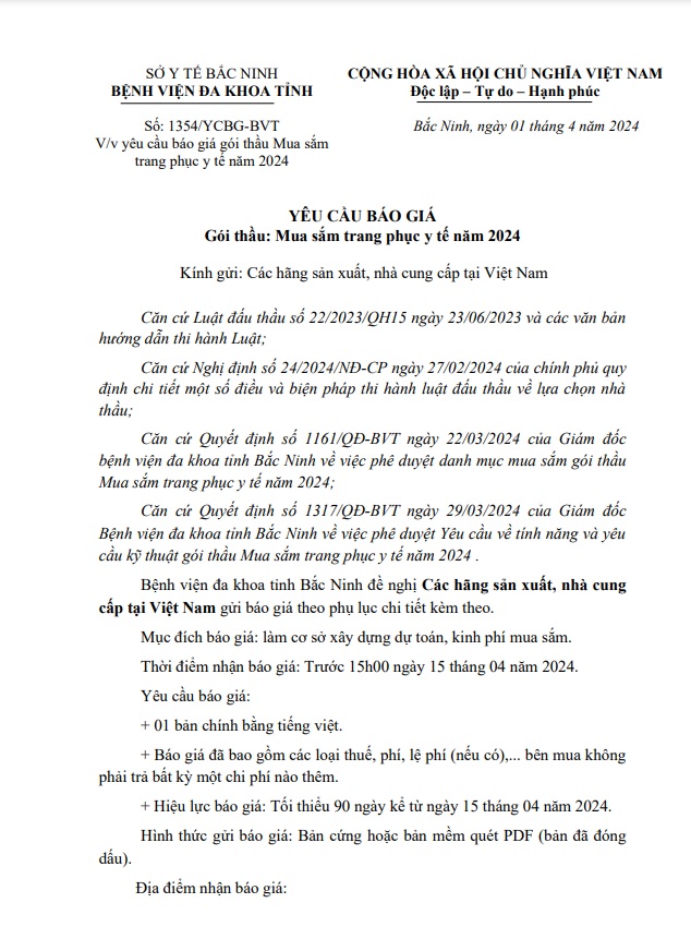 Yêu cầu báo giá Gói thầu Mua sắm trang phục y tế năm 2024