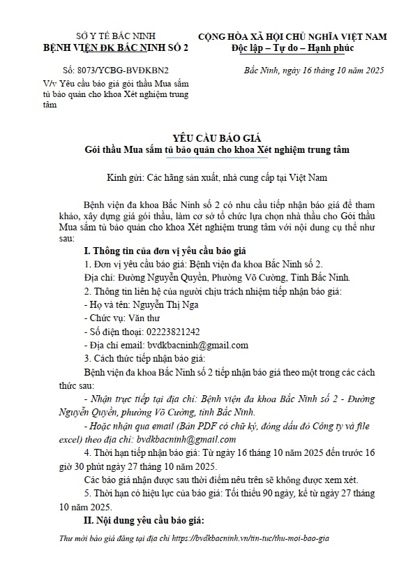 Yêu cầu báo giá gói thầu Mua sắm tủ bảo quản cho khoa Xét nghiệm trung tâm