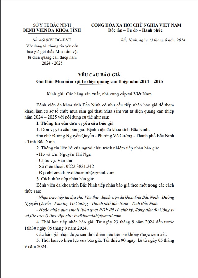 Yêu cầu báo giá gói thầu Mua sắm vật tư điện quang can thiệp năm 2024-2025