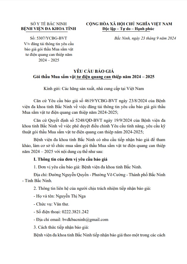 Yêu cầu báo giá gói thầu Mua sắm vật tư điện quang can thiệp năm 2024-2025